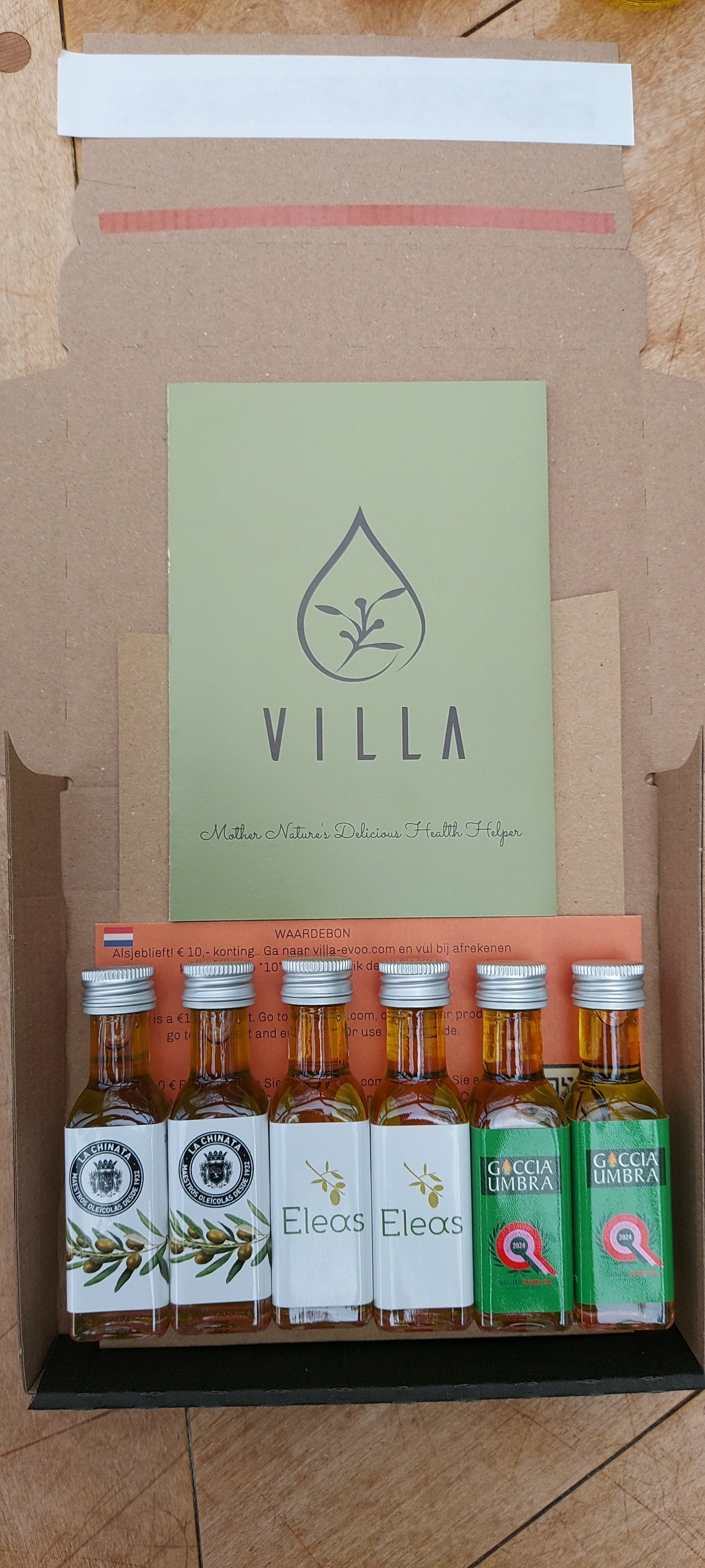 Zo kan je rustig met elkaar proeven en je keuze maken. Als je één van de drie olijfolies kiest, kan je met de ingesloten tegoedbon gelijk EUR 10 korting krijgen op je eerste bestelling
